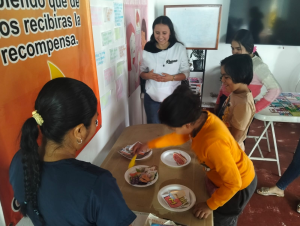 La actividad fue orientada por la profesora Edna Rojas, docente de UNIMINUTO, quien lideró el proceso pedagógico con el apoyo de estudiantes en práctica, fortaleciendo así el componente formativo del voluntariado universitario. A lo largo del taller, la lectura guiada y la narración de historias dieron paso a dinámicas lúdicas, preguntas abiertas y ejercicios de participación que facilitaron la comprensión de hábitos saludables desde edades tempranas.