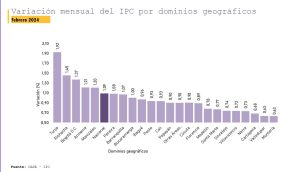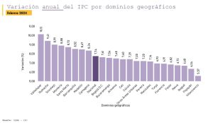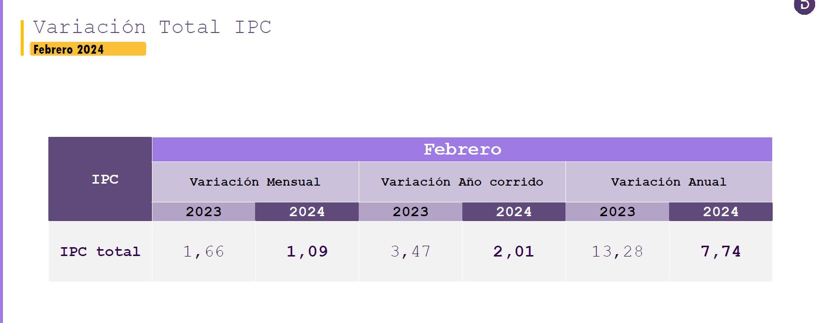 En este lapso la variación anual del IPC fue 7,74% debido, principalmente, a la variación anual de las divisiones Alojamiento, agua, electricidad, gas y otros combustibles y Transporte. La división Transporte registró una variación anual de 11,97%, siendo esta la mayor variación anual. La segunda de mayor variación anual fue la división Educación con 11,66%. Mientras, la división Información y comunicación registró una variación anual de 0,21%, siendo la de menor variación anual. “La división transporte registró una variación anual de 11,97%, siendo esta la mayor variación anual. En febrero de 2024, los mayores incrementos de precio se registraron en las subclases: combustibles para vehículos (43,86%), peajes (14,93%) y transporte escolar (13,61%). Las mayores disminuciones de precio se reportaron en las subclases: transporte de pasajeros y equipaje en avión (incluye pagos por exceso de equipaje) (-19,81%), llantas y neumáticos, rines para vehículo (-4,88%) y vehículo particular nuevo o usado (-1,61%)”, indicó el Dane.A su turno, precisó que la división Educación registró una variación anual de 11,66%, siendo esta la segunda mayor variación anual. En febrero de 2024 los mayores incrementos de precio se registraron en las subclases: diplomados, educación continuada, preicfes, preuniversitarios (16,54%), educación secundaria (12,88%) y educación preescolar y básica primaria (12,15%). Los menores incrementos de precio se reportaron en las subclases: otros gastos en educación superior (8,62%), cursos de educación no formal (9,53%) y pagos por asesorías de tareas y clases dictadas por particulares (9,93%). La división Información y comunicación registró una variación anual de 0,21%, siendo esta la menor variación anual. En febrero de 2024, el mayor incremento de precio se registró en la subclase: servicios de comunicación fija y móvil y provisión a internet (0,35%).