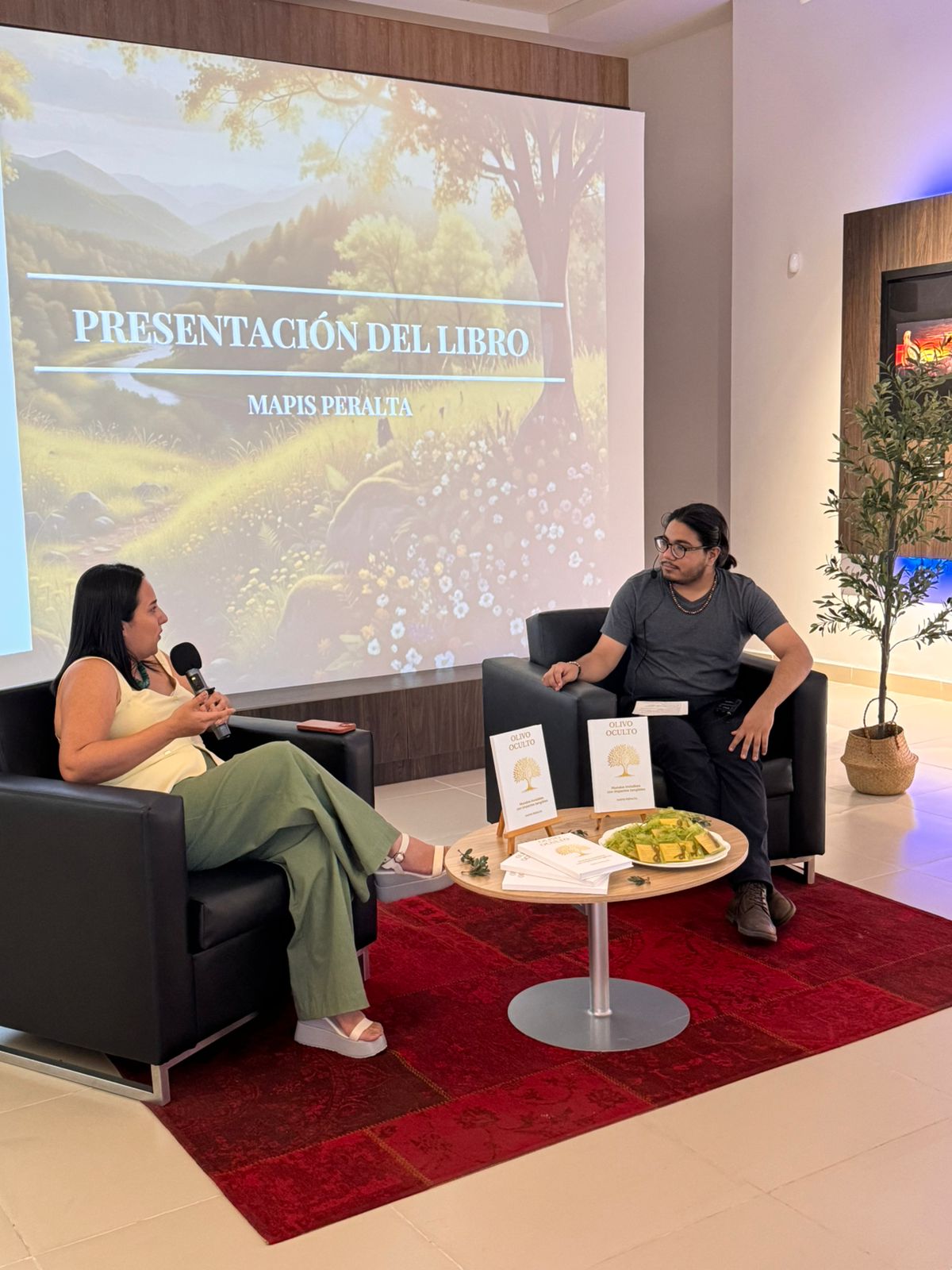 El escenario estuvo cuidadosamente dispuesto para generar cercanía: dos sillones enfrentados, una mesa con ejemplares del libro y detalles que evocaban la naturaleza, en sintonía con un árbol del olivo, símbolo de paz y fortaleza. La velada incluyó momentos de lectura, diálogo abierto y un brindis que celebró la creación literaria y la conexión humana.