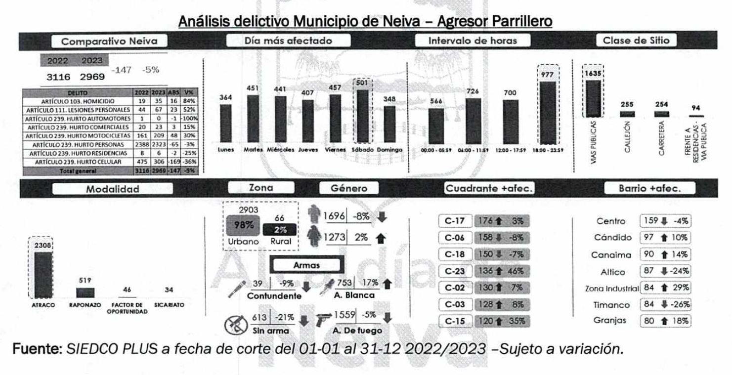 En 2023 se registraron 92 homicidios en la ciudad de Neiva, donde el 38% (35 casos) se materializaron a partir de la ejecución del parrillero en motocicleta, así mismo, se presentaron 6.075 hurtos a personas donde el 38% (2.323 casos) fueron realizados por el parrillero, de igual forma, se hurtaron 543 motocicletas donde el 39% (209 casos) fue el parrillero quien realizó el hecho delictivo. Informe de la Policía agrega que en comparación al año 2022, se puede observar una tendencia al aumento de casos reportados para el año 2023, en donde incide el parrillero como actor criminal, se presenta por ejemplo, en los casos de homicidio, el cual tuvo un incremento del 84%, el hurto a motocicletas en un 30%, lesiones personales en un 52% y finalmente el hurto a comerciales en un 15%.